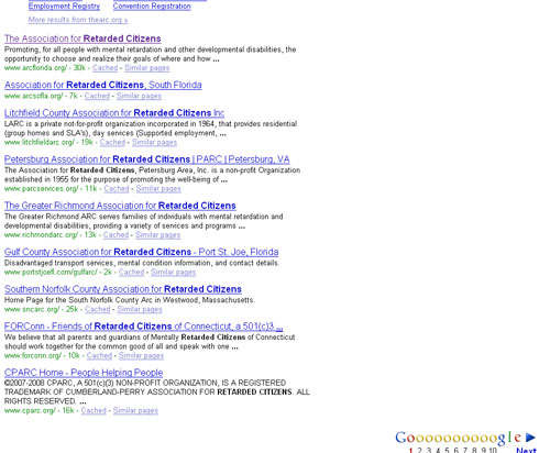 Anyway, cut to today, and somehow I run across dozens of very useful organization who help individuals who are, through no fault of their own, mentally disabled and who struggle in a world that is too often unfriendly and unfair to them. But, these organizations use the “r-word” so I am boycotting them. Not that I was sending them money, anyhow, but now I really will not send them money if I ever get money. Seriously, I was surprised to see the word show up in the search results and in some cases on the home pages of these organizations.